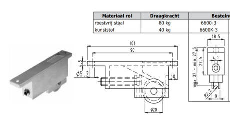 Une seule roulette de porte coulissante en nylon, comme celle d'Eland Brand, est principalement accrochée à l'arrière du profil. Ce type de roulette reste en place grâce à des billes. Le réglage se fait via une vis, qui pousse la roulette vers le bas et soulève la porte coulissante. Un grand avantage de ce système est que le seuil inférieur n'a pas besoin d'être retiré lors de l'installation.